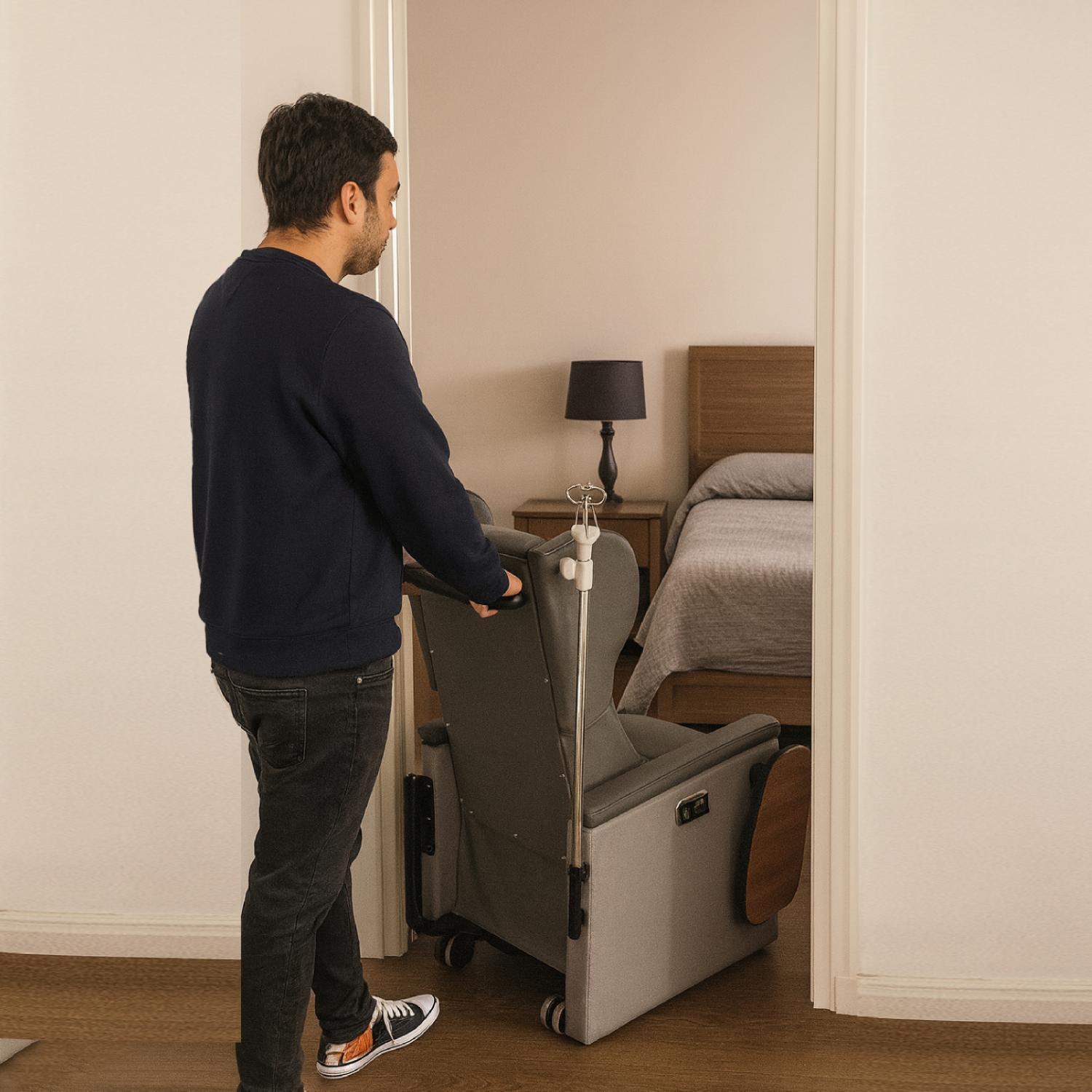 Gracias a su mecanismo de reclinación neumático, permite ajustar el respaldo y el soporte de piernas en múltiples posiciones, alcanzando hasta 180° de reclinación. Además, incorpora una barra de traslado en el respaldo para facilitar su movilidad, junto con portasuero, mesa de alimentación, brazos de altura regulable y un brazo derecho abatible que mejora el acceso y la asistencia del paciente.
