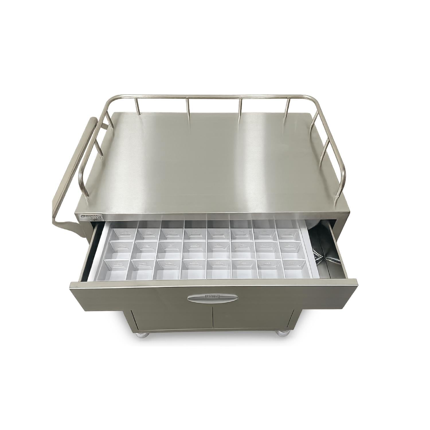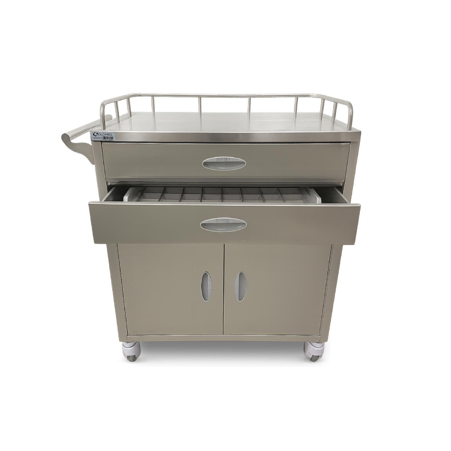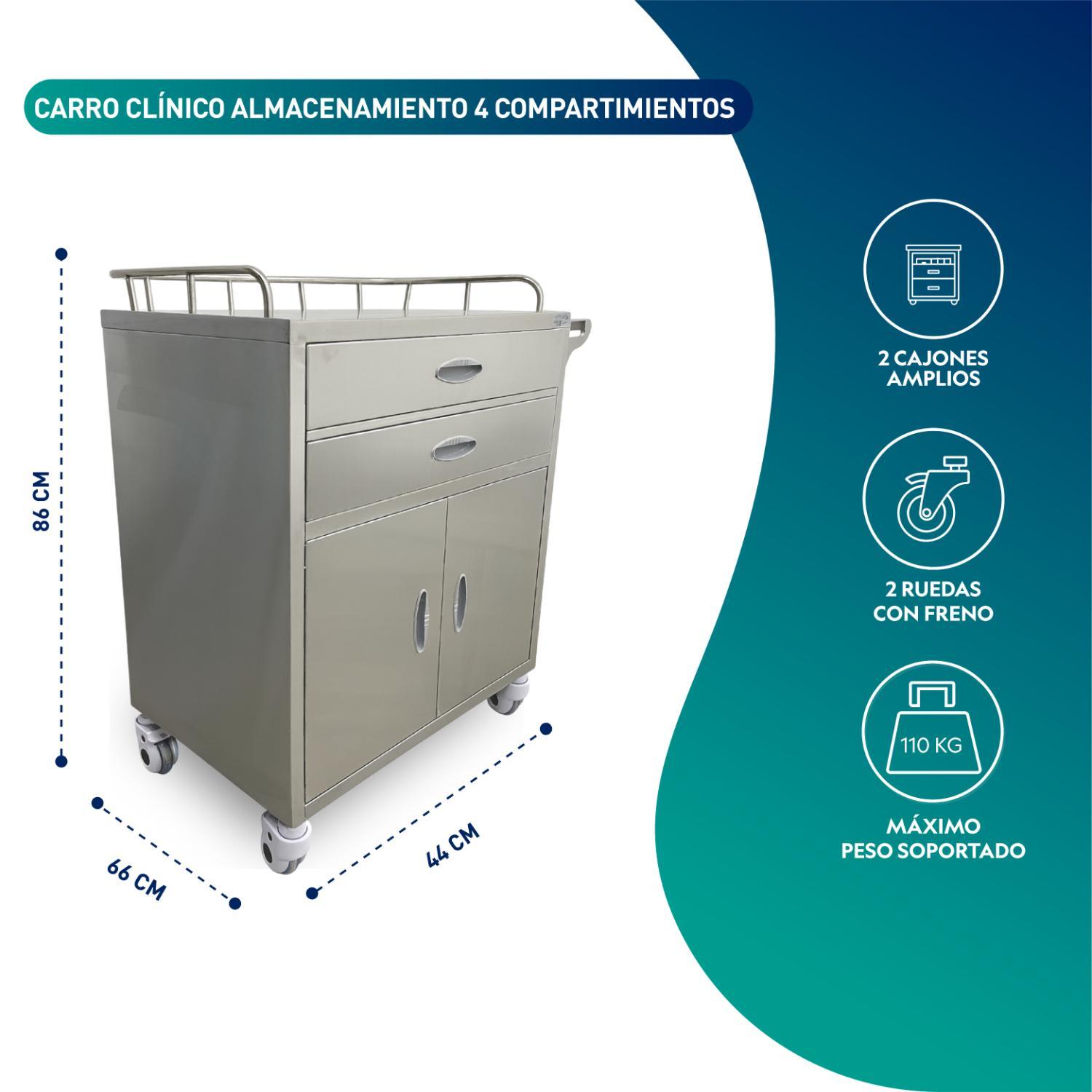 - Incluye 2 cajones amplios con divisores internos para medicamentos y 1 gabinete inferior con puerta para insumos clínicos.