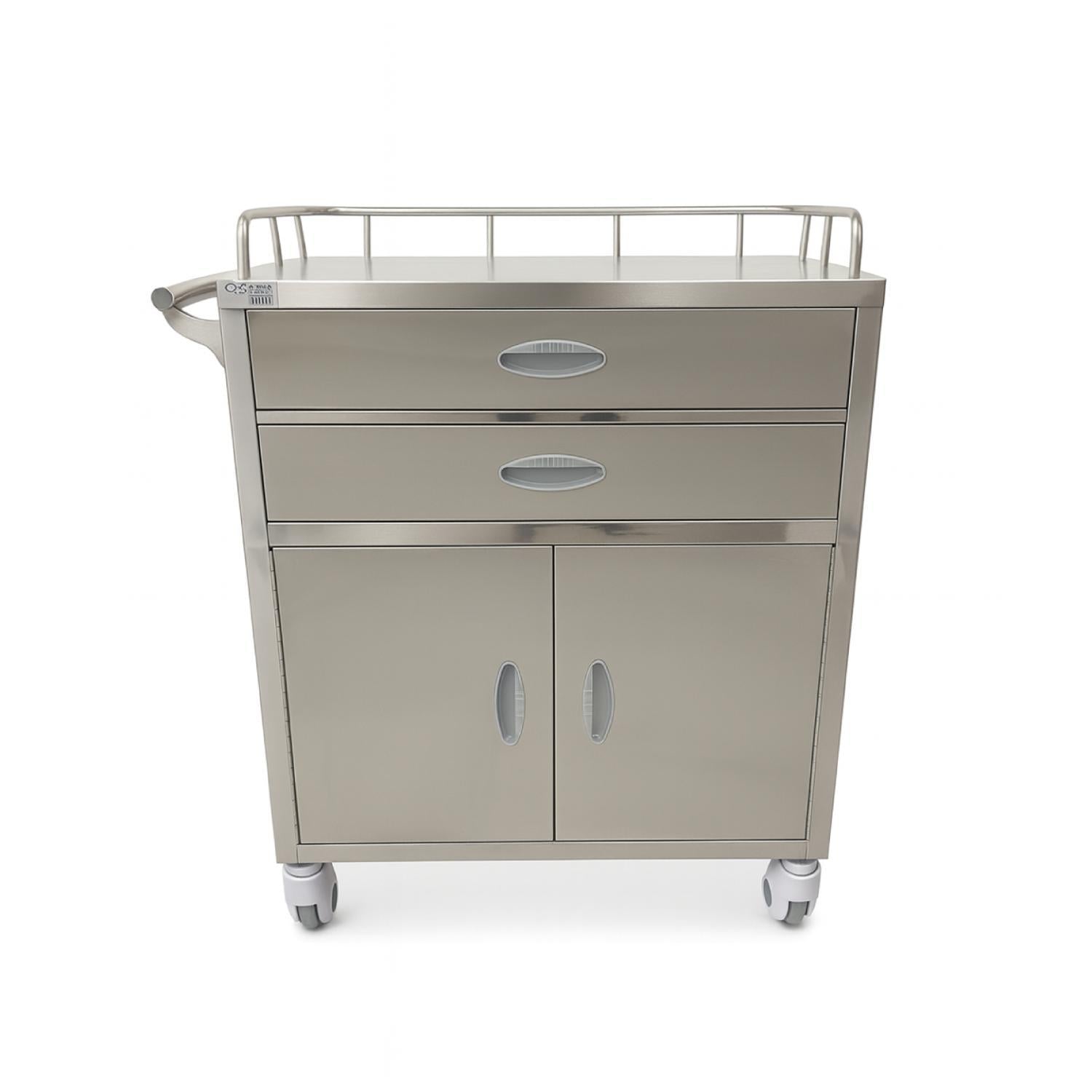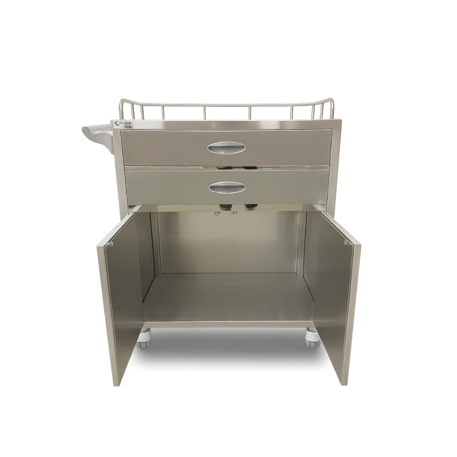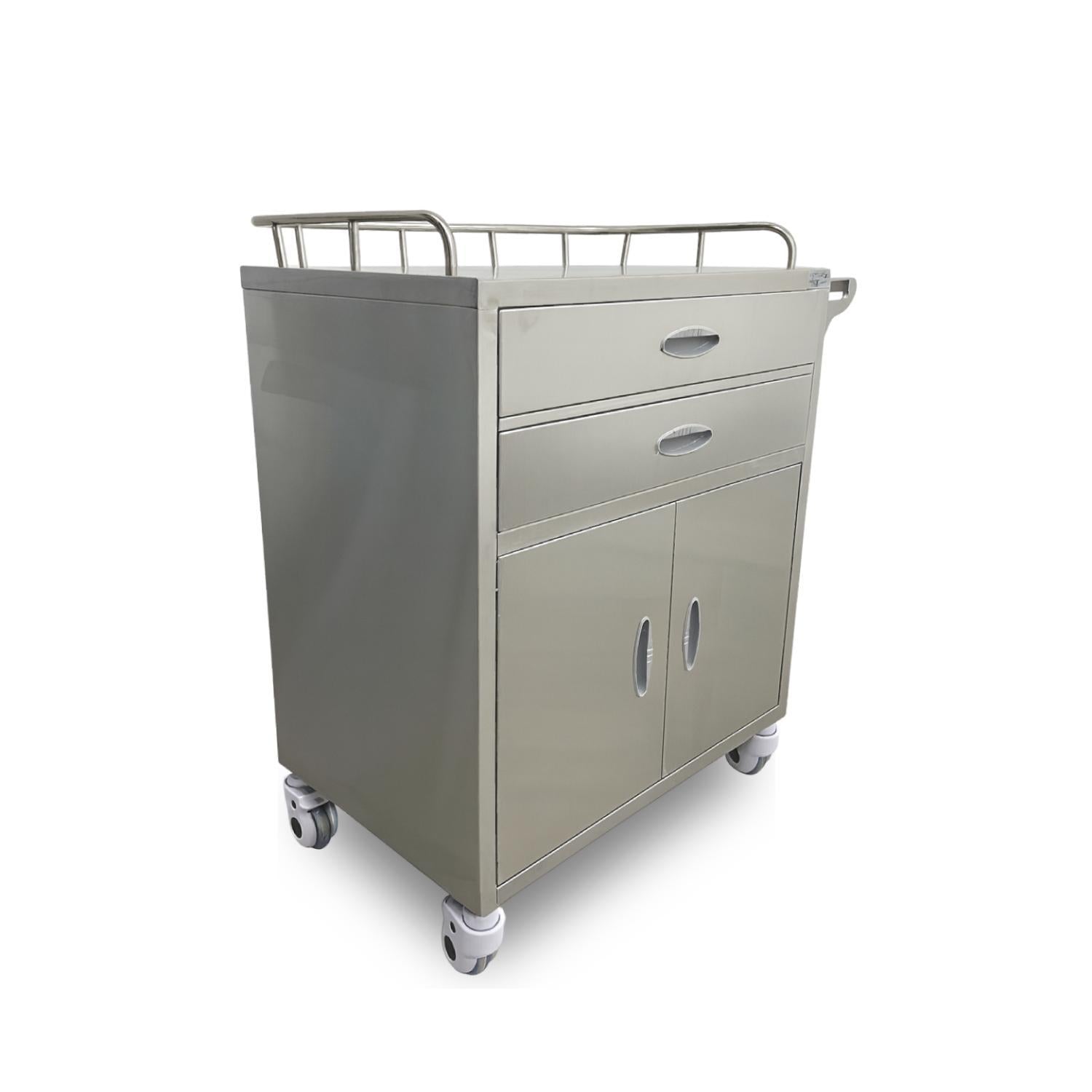 Cuenta con dos cajones amplios con divisores internos para medicamentos y un gabinete inferior con puerta, ideales para mantener insumos y materiales clínicos de forma ordenada, segura y siempre accesible.