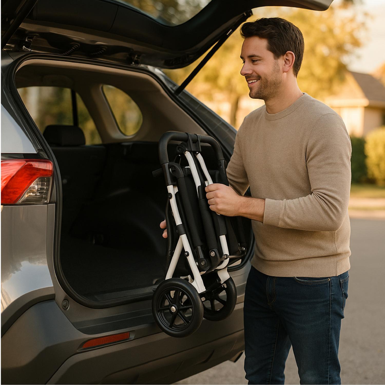 Su estructura plegable y liviana facilita el transporte en el baúl del auto, en avión o en transporte público, ocupando el menor espacio posible. Está fabricada en acero reforzado con acabado anticorrosivo, lo que asegura durabilidad y confianza en el uso diario.